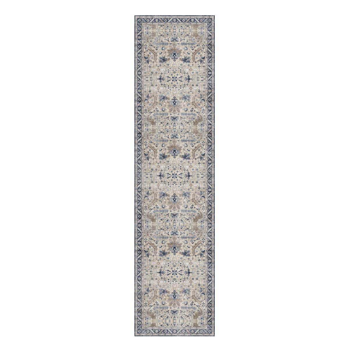 (B876) Dove Ivory & Blue Medallion Washable Runner, 2x8
