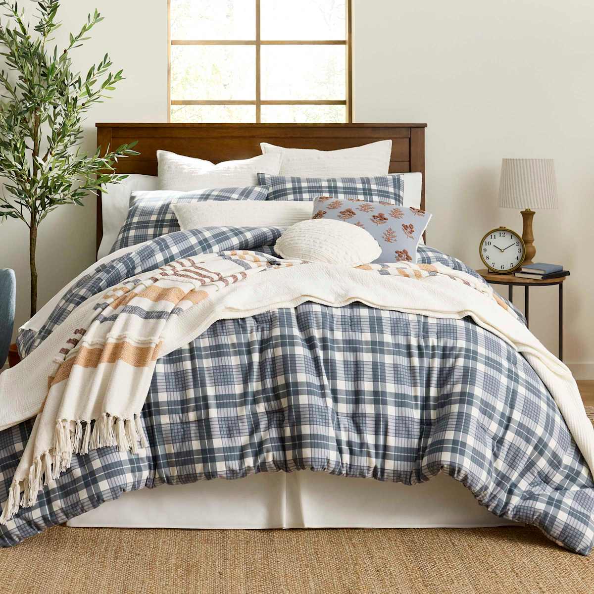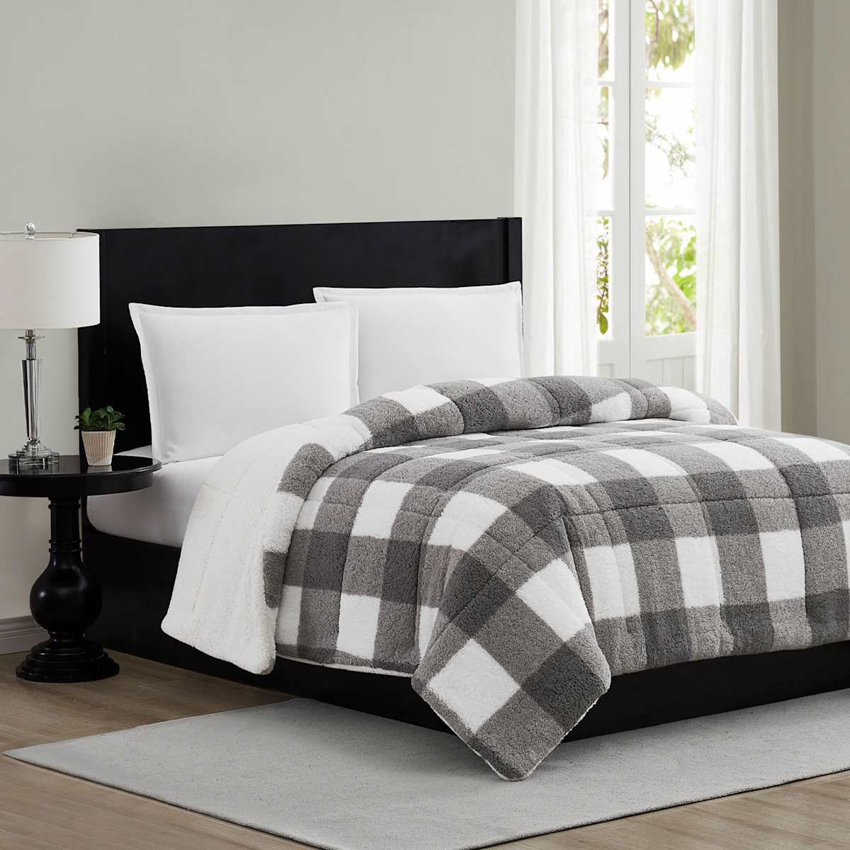 Grey Buffalo Plaid Sherpa Comforter, Queen