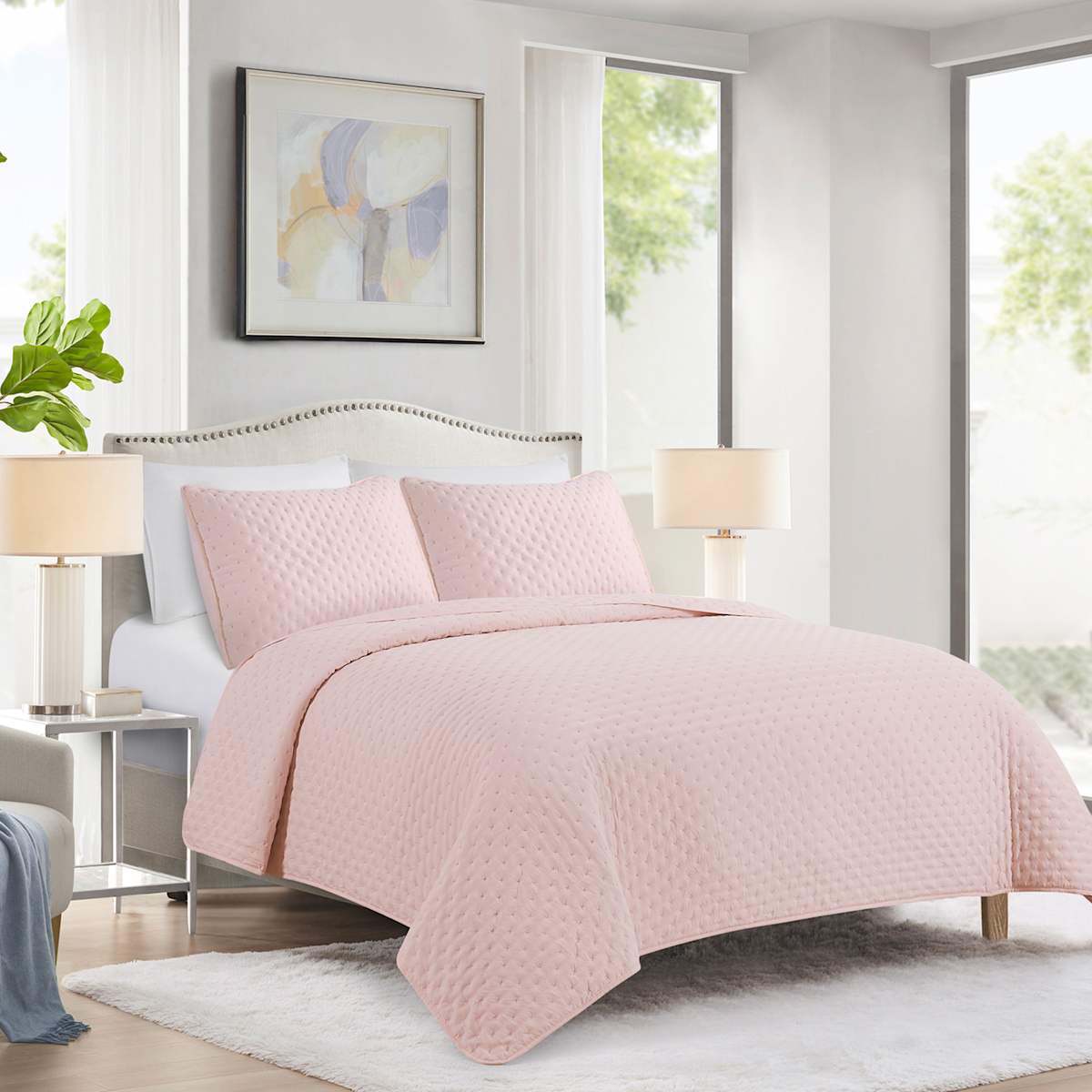 3-Piece Pink Grid Microfiber Quilt Set, Full/Queen
