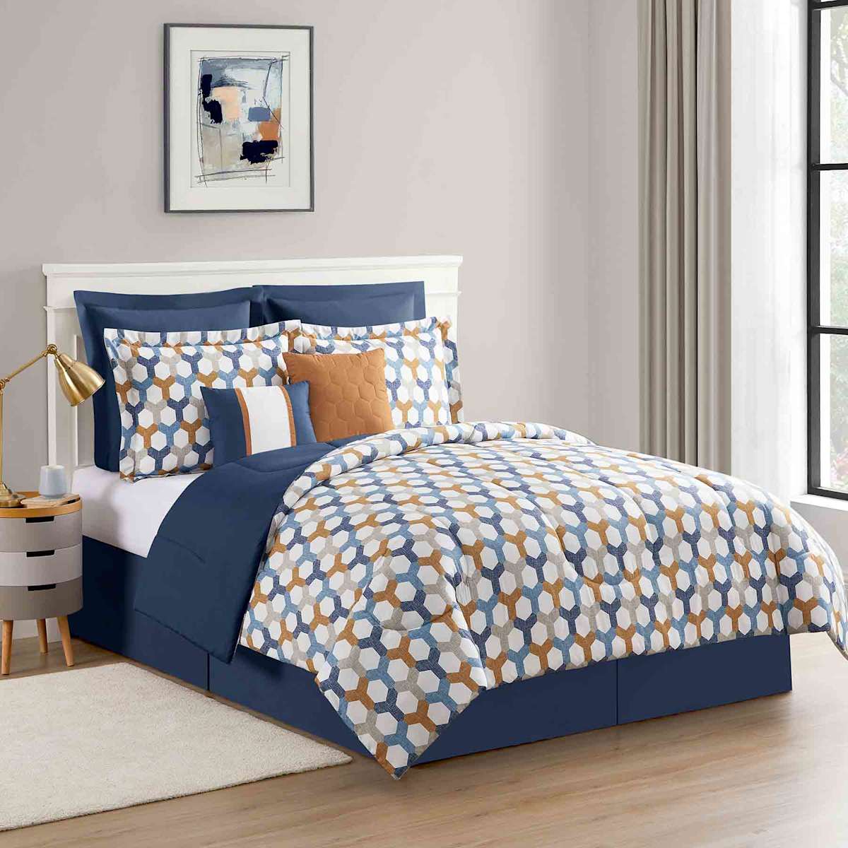8-Piece Blue Hexagon Striped Essential Comforter Set, Full