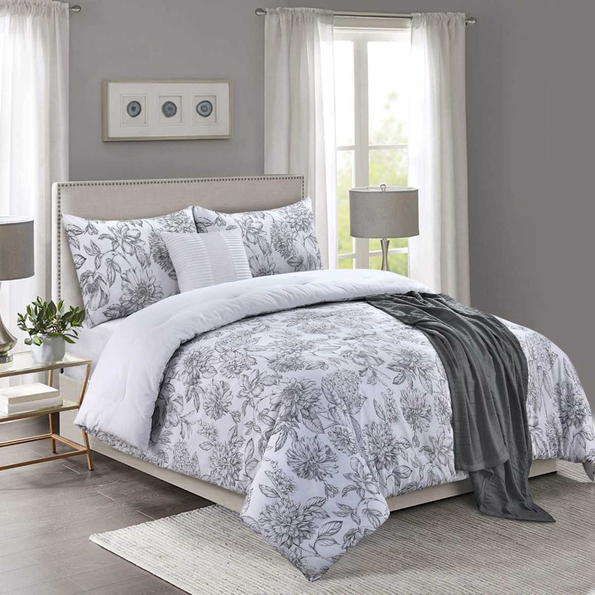 4-Piece Black & White Floral Print Comforter Set, Twin/Twin XL