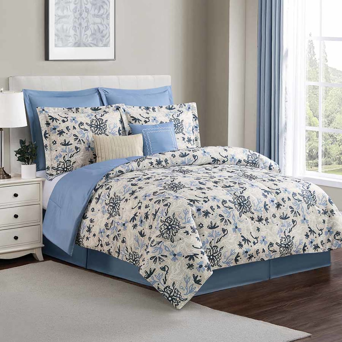 8-Piece Blue & White Floral Linen Essential Comforter Set, Full