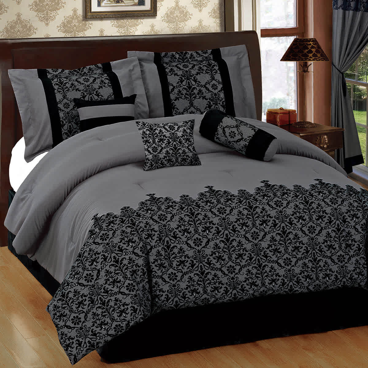 7-Piece Grey Deluxe Flocked Lace Premium Comforter Set, King