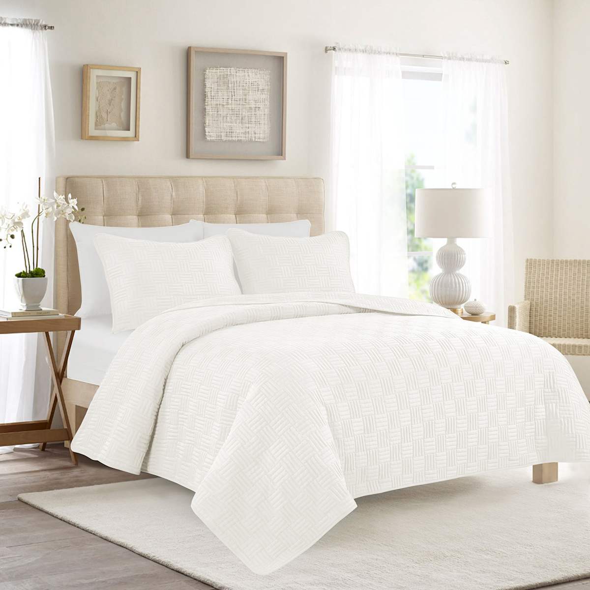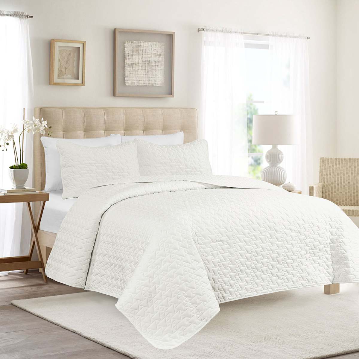 3-Piece White Geo Washed Microfiber Quilt Set, Full/Queen