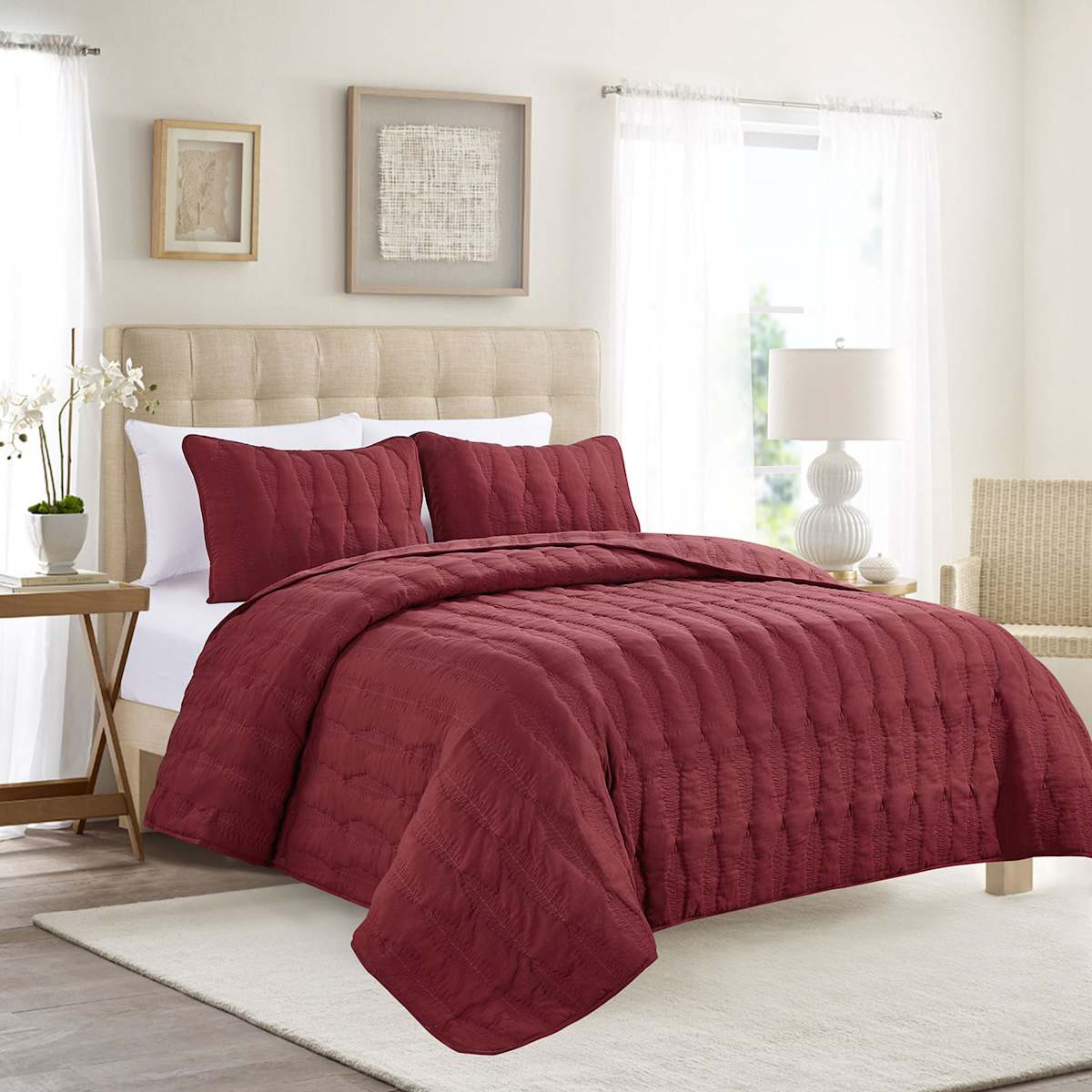 3-Piece Red Embroidered Washed Microfiber Quilt Set, Full/Queen