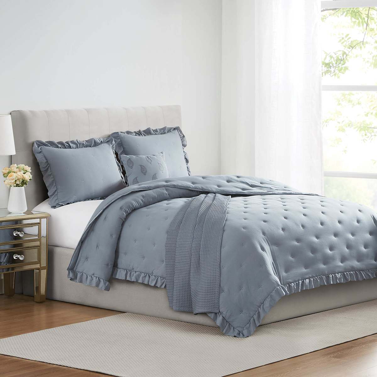 5-Piece Light Blue Garment Washed Ruffle Comforter Set, King